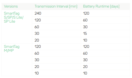 What are the battery runtimes in days according to the transmission intervals?